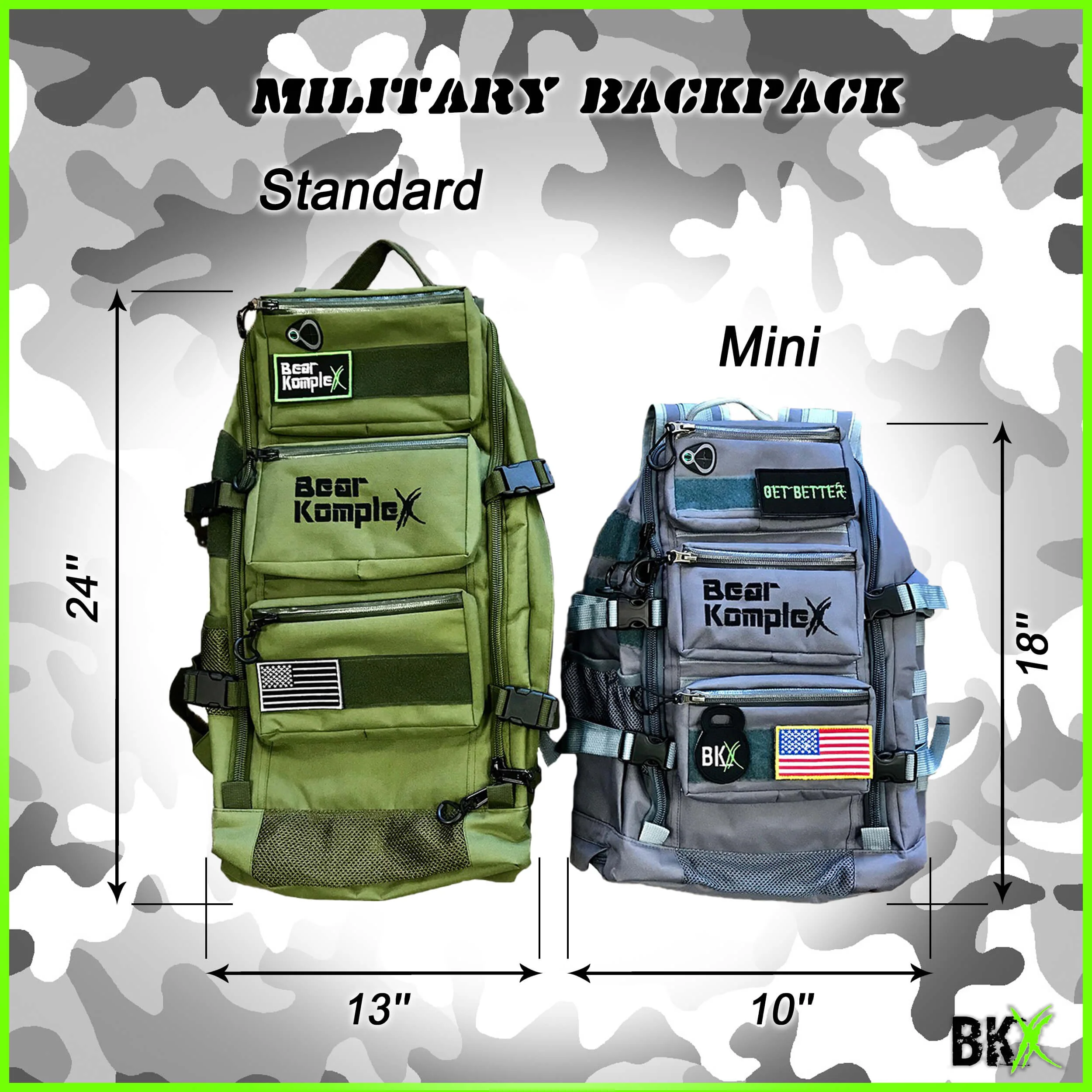 The BKX Mini Military Backpack is loaded with pockets and storage compartments to keep all your gear together for your fitness and adventure needs. This tactical backpack is constructed from the highest quality military grade 1000D nylon and is made to last. It includes exterior and interior pockets, a spot for your laptop, vented pocket for your wet clothes, shaker/waterbottle holder, sternum strap, headphone/earbud cord passthrough and more! This bag has it all. Make the bag your own with custom patches for your everyday lifestyle as an athlete, student, parent, etc.