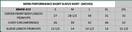 Men’s Performance Short Sleeve Shirt 90% Polyester 10% Spandex. FABRIC PROVIDES ENOUGH STRETCH AND FREEDOM OF MOVEMENT FOR PERFORMANCE APPLICATIONS.